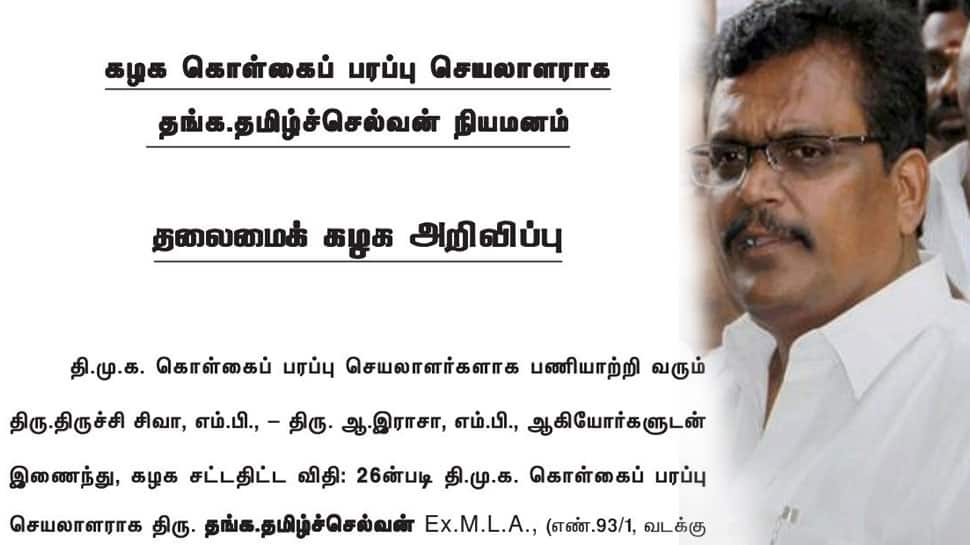 விதி 26படி, தங்க தமிழ்ச்செல்வன் கொள்கை பரப்பு செயலாளராக திமுக தலைமை கழகத்தால்